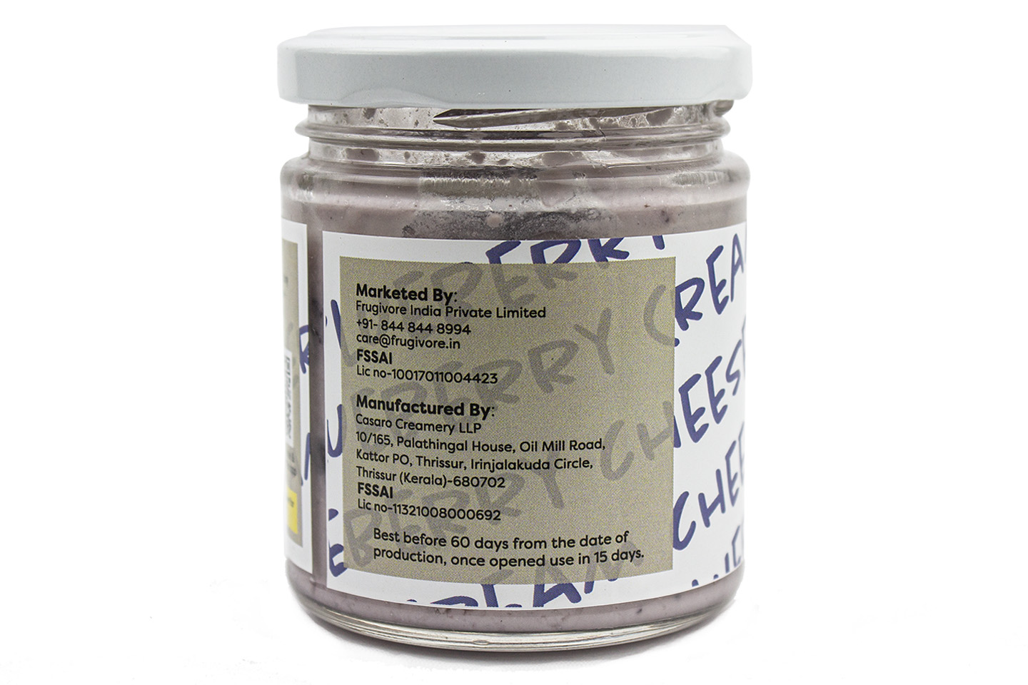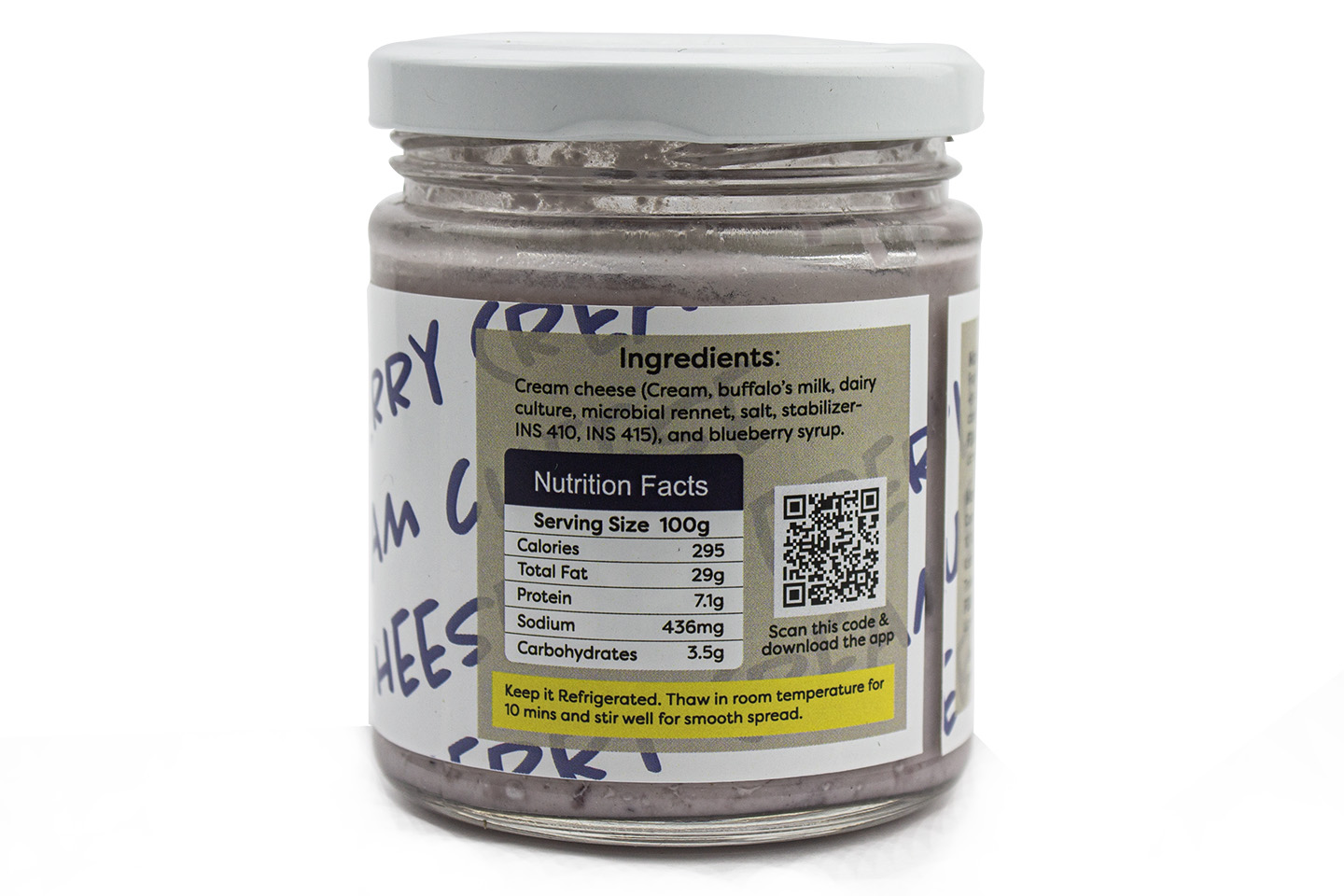 Cream Cheese(Cream, Buffalo milk, Dairy Culture, Microbial rennet, Salt, Stabilizer - (INS 410, INS 415), and Blueberry Syrup.